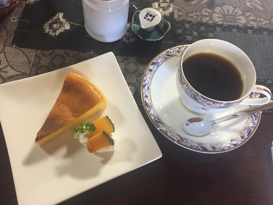 コーヒーと一緒に写っているケーキはカボチャの燻製を使ったカボチャのチーズケーキ。